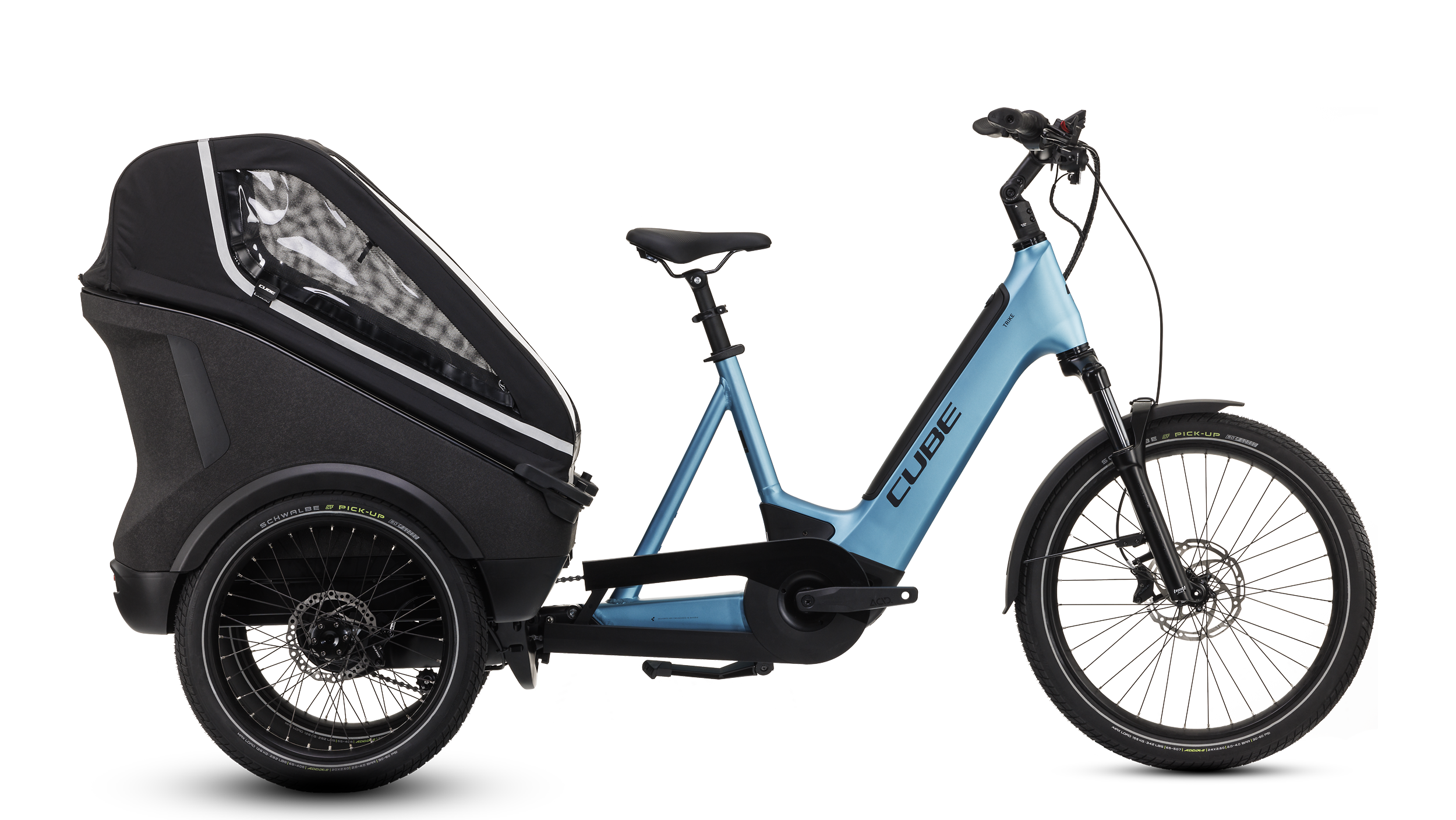 Marque: Cube Modèle: Trike Hybrid Family 750 Equipement: Enviolo Cargo manual | Bosch Kiox 300 Couleur: blue´n´reflex Cadre: Entrée basse, 46cm Taille cycliste: 160-190cm Garantie Cadre: Garantie Cadre: 6 ans Matériau Cadre: Aluminium Fourche: SR Suntour MOBIE 34 CARGO 24", 100mm Moteur: Bosch Cargo Line Smart System 36V 250W 25kmh Couple du Moteur: 85Nm Capacité Batterie: 750 Wh Poids: 75kg Poids maximal autorisé: 220 kg Charge max arr.: 50kg Charge max. Avant: 20kg Longueur totale env.: L. 220cm x l. 74cm Empattement: 148.7cm Dim. Bac arr.: 601x 535mm (Eurobox: Ok) Hauteur axe de pédalier: 20cm Reach (cm): 39.1cm stack (cm): 61.3cm Pneus : Schwalbe Pick-Up, Super Defense, 65-406 / 65-507 Taille des pneus: arr. 65-406 / avt. 65-507 Pression des pneus: 2-4Bar Freins: Tektro Auriga Twin+ avec frein de stationnement (180/160) Dimension Disques: 180 / 160 Eclairage: arr. Supernova T-M99, avt. ACID Front Light PRO-E 110, 5-16V, DC Tige de selle: Satori Sorata 34,9mm, 280mm -440mm (position haute) Jeu de Direction: ACROS FI-Link, Top Zero-Stack 1 1/2" (ZS 56mm), Bottom Zero-Stack 1 1/2" (ZS 56mm) Entraînement Avt.: ACID E-Crank, 170mm, 42Dents Moyeu roue Arr.: Cube Trike Hub, Straightpull Moyeu roue Avt.: Cube Cargo Hub, 36H, Straightpull, 110x15mm Boost