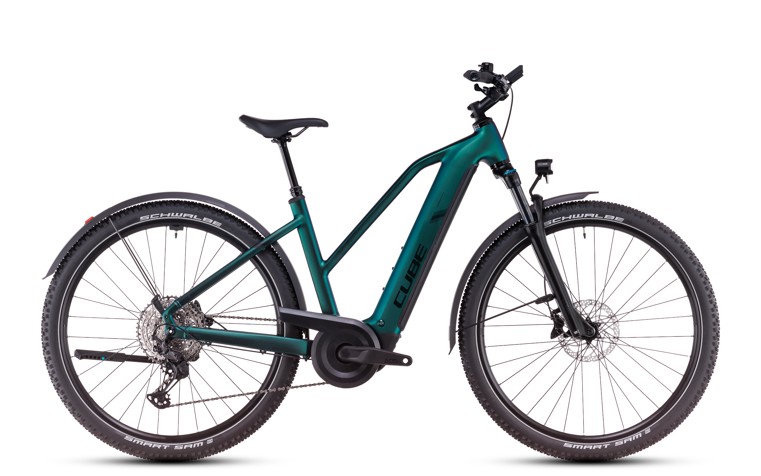 Kompromisse sind nicht so unser Ding hier bei CUBE, deshalb haben wir das Nuride Hybrid EXC Allroad auch mit der superzuverlässigen 12-fach Shimano XT Schaltung und einem Bosch CX Antrieb samt PowerTube Akku bestückt. Außerdem mit breiten, griffigen Pneus von Schwalbe und einer geschmeidig dämpfenden Suntour Luftfedergabel mit 100 mm Federweg, die vor allem auf holprigen Wegen jede Menge Fahrkomfort mitbringen. Sicheres Verzögern und Anhalten, selbst bei widrigem Wetter und Nässe, ist das Spezialgebiet der leistungsstarken hydraulischen Scheibenbremsen mit 4-Kolben-Konstruktion von Shimano. Last, but not least das Sahnehäubchen: die Allroad Zubehörausstattung, bestehend aus Schutzblechen, Lichtern und einem stabilen Seitenständer. Da kann das nächste Touren-Abenteuer kommen!