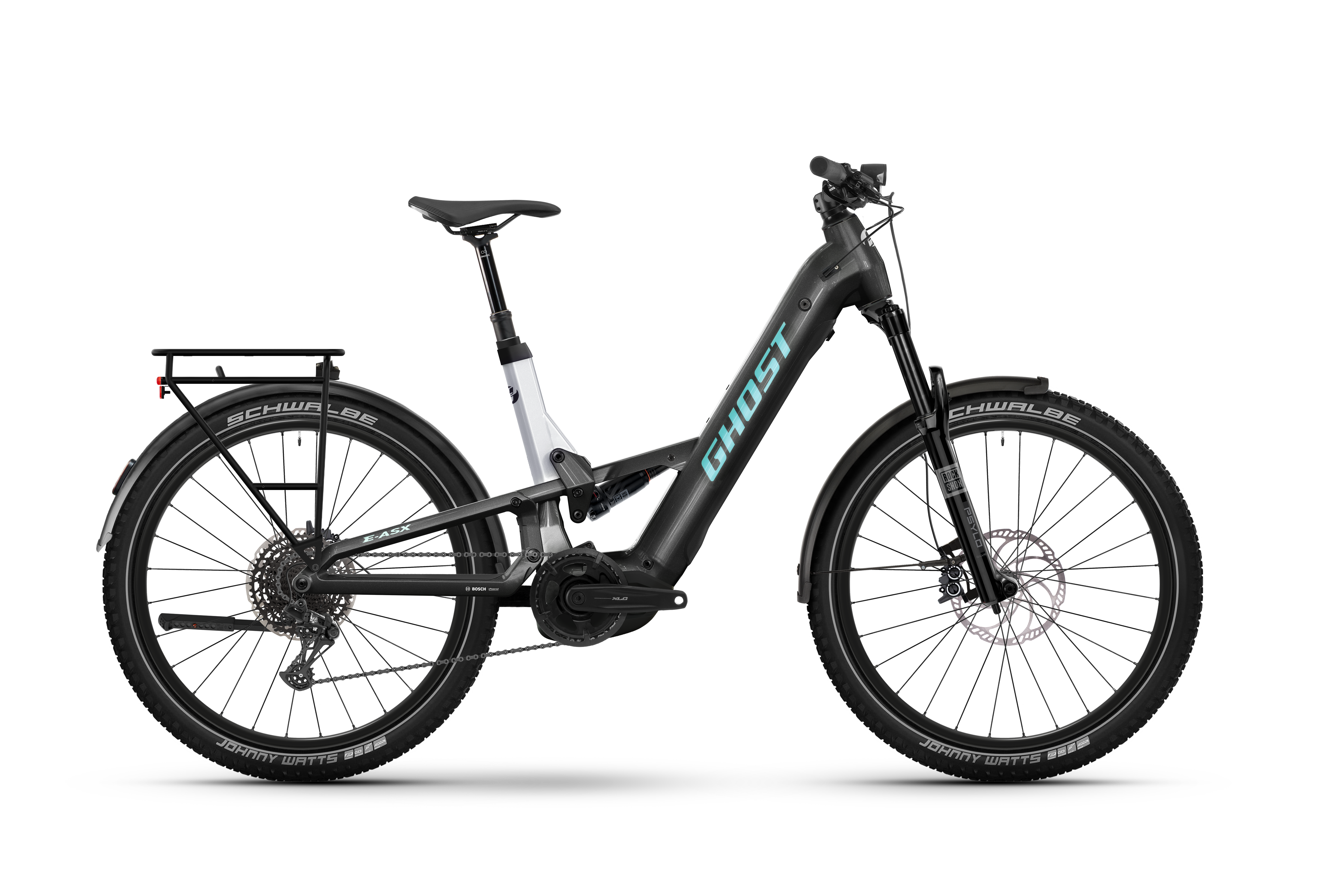 Preishammer! Die beste Preis Leistung bei uns. Perfekt für den Alltag - und die Flucht daraus. Das GHOST E-ASX Universal EQ ist ein echtes Crossover E-Bike, geeignet für die letzte Meile in der Stadt, genauso wie für den Offroad-Einsatz und Micro Adventures. Mit seinem geradlinigen, kantigen Design ist dieses vollgefederte E-Mountainbike ein echtes Fashion Statement. Dank Beleuchtung, Schutzblechen und Gepäckträger bist du für jede Mission gerüstet – egal ob im Großstadtdschungel oder auf unwegsamen Waldwegen. Die 160mm Federweg vorne und 150mm hinten sind eine echte Kampfansage an Kopfsteinpflaster, Bordsteine und Wurzeltrails, während der Bosch Motor und der 800WH Akku für die notwendige Power sorgen. Möge das Abenteuer beginnen!