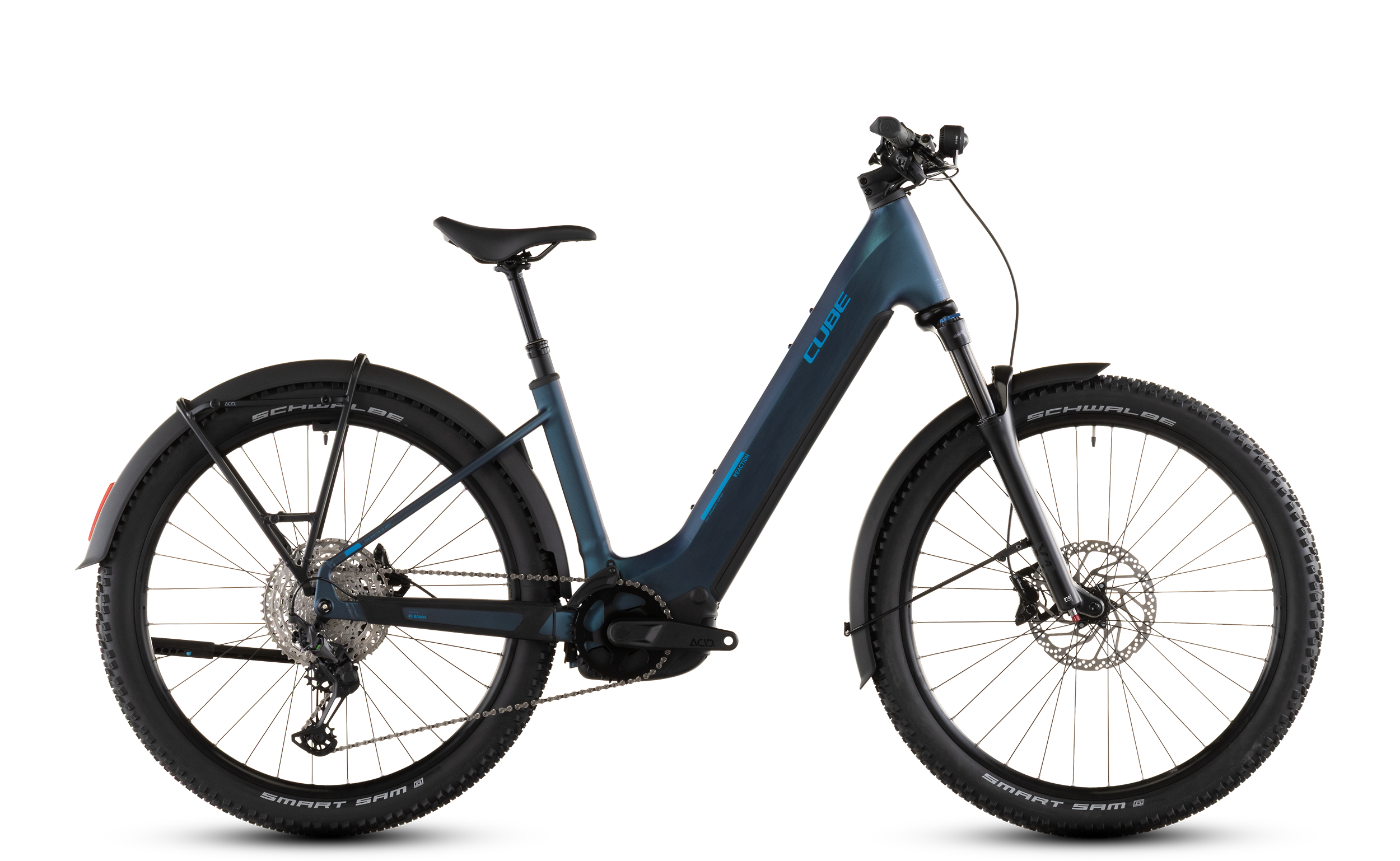 Das Beste aus zwei Welten: Das Reaction Hybrid Pro FE kombiniert die Vielseitigkeit eines voll ausgestatteten Tourers mit der Robustheit eines Mountainbikes und dem Support durch einen E-Motor. Dabei hat das Bike neben Schutzblechen, Gepäckträger, Seitenständer und Lichtern noch weitere Highlights auf Lager. Dank dem leistungsstarken Bosch CX Motor und 800 Wh starken Akku sind jede Menge Power und Reichweite garantiert, und zwar auf jeder Route, ob über Asphalt oder im Gelände. Dabei macht die einfach bedienbare Shimano XT 12-fach Schaltung selbst steile Anstiege zum Kinderspiel. Bergab packen die hydraulischen 4-Kolben-Scheibenbremsen von Shimano kraftvoll zu und verzögern die griffigen Schwalbe 2.6 Zoll Reifen zuverlässig und sicher. Für eine Extraportion Fahrkomfort und Kontrolle auf ruppigeren Strecken haben wir eine Luftfedergabel mit 120 mm Federweg (100 mm bei kleinen Rahmengrößen und allen Tiefeinsteiger-Modellen) und eine versenkbare Sattelstütze verbaut.