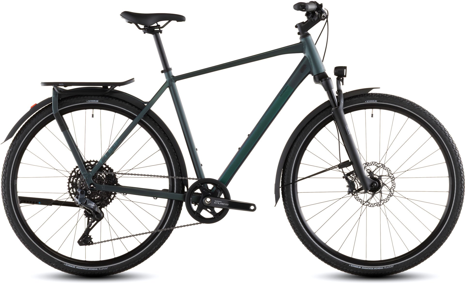 Die ultimative Freiheit auf zwei Rädern: Bei der Entwicklung des CUBE Kathmandu SLT haben wir mal wieder unglaublich viel Liebe zum Detail walten lassen. So fährt sich dieser Tourer dank geschmeidig dämpfender RockShox Paragon Gold Luftfedergabel nicht nur überaus komfortabel. Er begeistert auch mit seiner eleganten Erscheinung dank dem stabilen integrierten Gepäckträger IC 3.0. Dazu kommen superpraktische Features wie ACID Schutzbleche, Lichter und ein Seitenständer. Die leistungsstarken hydraulischen Shimano Cues Scheibenbremsen bringen die geschmeidig dahinrollenden, griffigen Schwalbe Marathon Mondial Reifen bei jedem Wetter zuverlässig zum Stehen. Als Sahnehäubchen geht ein elektronischer Shimano Cues Di2 Q'Auto 11-fach Antrieb mit Dynamosystem am Hinterrad mit auf Tour, der unterwegs automatisch immer in den passenden Gang schaltet. Einfach losradeln und genießen!