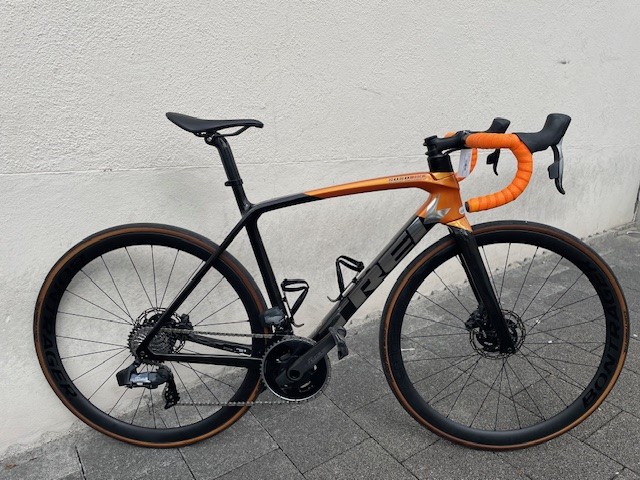 Trek Émonda SL7 – leicht, schnell, bereit für jeden Berg Technische Details (laut Foto / sichtbare Ausstattung) Modell: Trek Émonda SL7 Rahmen: ultraleichter Carbonrahmen (Trek OCLV-Carbon) — gebaut für Kletter- und Rennperformance Schaltung: elektronische 12-Gang-Schaltung (SRAM AXS – kabellos, sehr präzise) Kurbel / Powermeter: Power-Crank (sichtbarer Powermeter-Spider) — ideale Basis für Trainingsdaten Bremsen: hydraulische Scheibenbremsen (kraftvoll, zuverlässig bei Nässe und Abfahrten) Laufräder: Bontrager Carbonlaufräder, Hochprofil – steif, aerodynamisch, reaktionsschnell Reifen: Gummiwände (tan wall) — sportlich & griffig Cockpit: integrierter Lenker/Vorbau, Carbon-Sattelstütze für geringe Masse und direkte Steuerung Farbe / Look: auffälliges Orange/Schwarz mit farblich abgestimmtem Lenkerband — sportlich und individuell Zustand: gebraucht, gepflegt (funktionstüchtig; bei Interesse liefere ich gern genaue Angaben zu Servicehistorie, Rahmengröße und Kilometern)