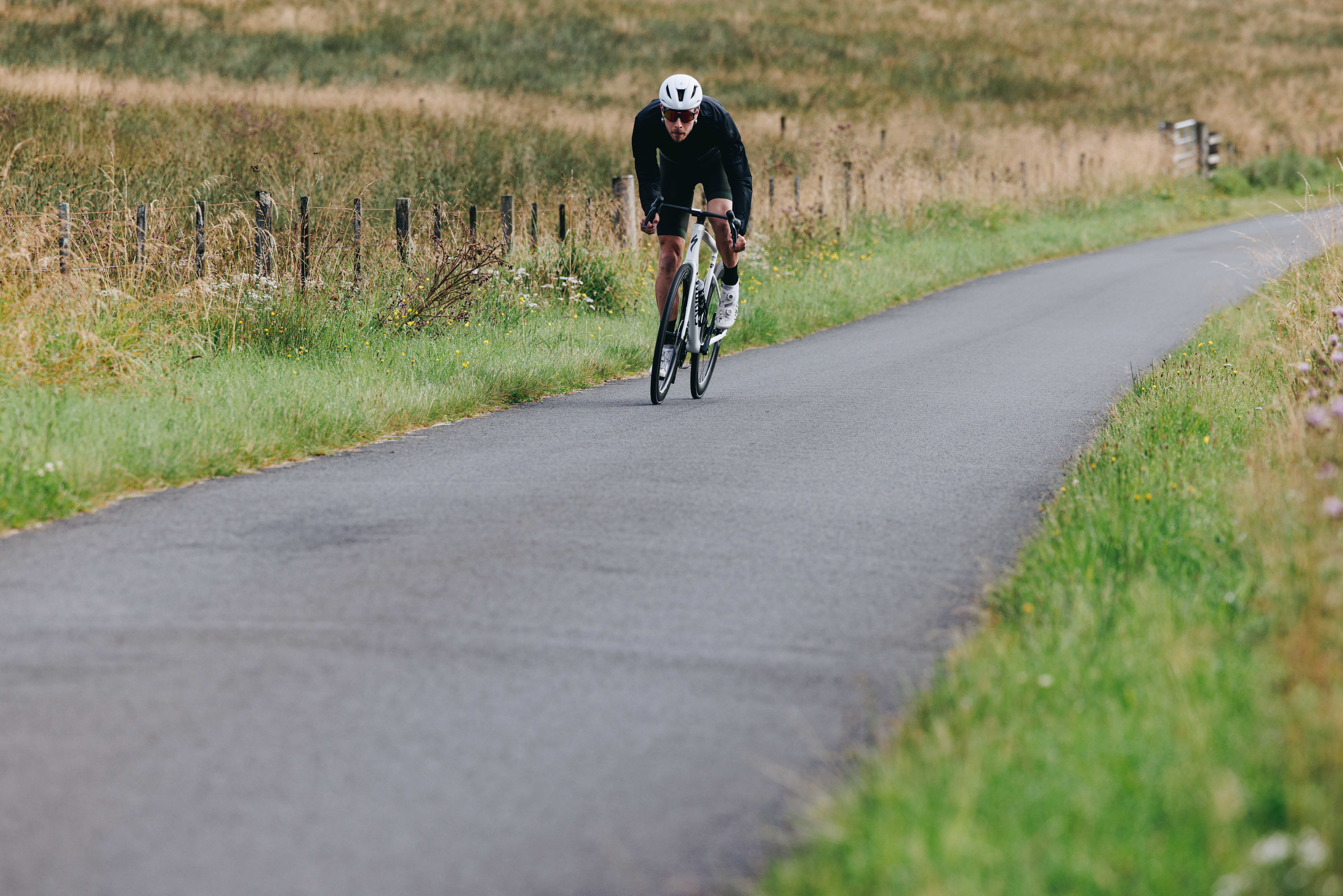 Auch beim Handling bleibt das Tarmac das Mass der Dinge. Wer bereits ein SL7 gefahren ist, findet sich auf dem SL8 sofort zurecht. Die Lenkpräzision ist sehr hoch, das Velo zieht durch schnelle Kurven, ohne nervös zu wirken, und die Front bleibt auch bei harten Antritten völlig stabil. Trotz der sehr schlanken Sitzstreben und nicht übermässig massiver Kettenstreben ist das Heck spürbar steif; der Tretlagerbereich wirkt extrem solide, die Kraftübertragung ist direkt.