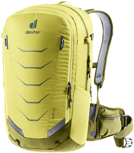Pared down to the essentials, the new Flyt still has all the features you need for a big day on the trails: Clips to attach a half-shell helmet, side compression straps to attach a full-face helmet and two stowable gear straps for attaching protective gear to the outside of the pack. And of course, there’s the TÜV/GS-certified back protector that’s easy to remove and provides maximum safety for when things go wrong. The deuter Airstripes back system on the Flyt provides excellent ventilation across the back.
