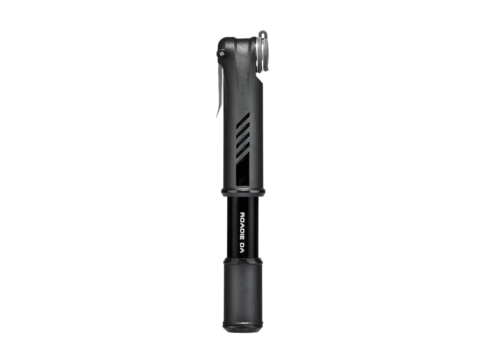The Roadie DA is the smallest and lightest mini pump from the Topeak DA family, designed specifically for racing bikes. DA stands for Dual Action technology, which doubles the volume with every stroke, filling your tire with air during both the pull and push, achieving a tire pressure of up to 120 psi / 8 bar twice as fast. The thumb clamp lever securely holds the pump head firmly on the valve. While riding, the dust cap protects the pump head from dust and dirt, keeping it ready for use at all times. This small pump, measuring just 18 cm in length, fits discreetly in the mount next to the bottle holder, but can also fit in any jersey pocket.