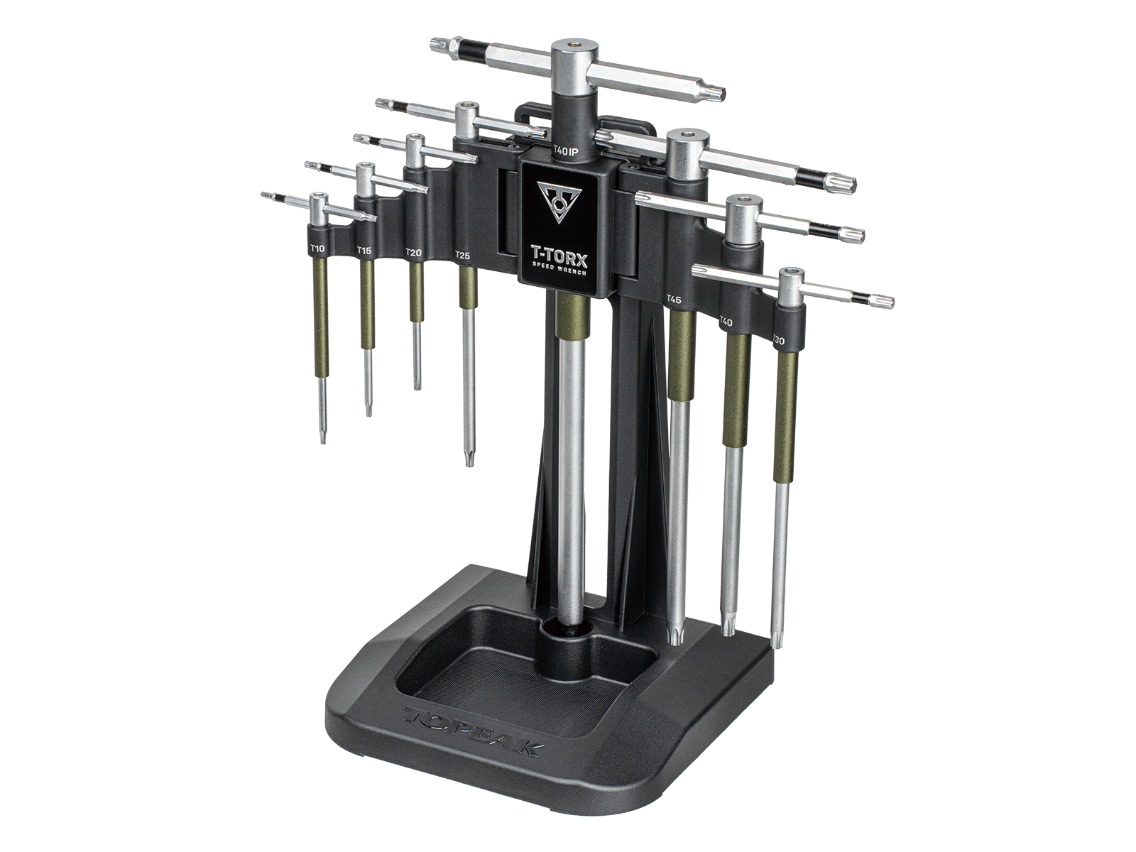 The Topeak T-Torx Speed Set consists of 8 professional-quality Torx keys. Hardened steel minimizes wear and ensures a longer tool lifespan. Torx® heads at each end of the handle allow for additional leverage, while a Speed Sleeve quick-turn sleeve facilitates increased speed and efficiency when screwing. The included tool holder keeps the wrenches readily accessible and well organized.
