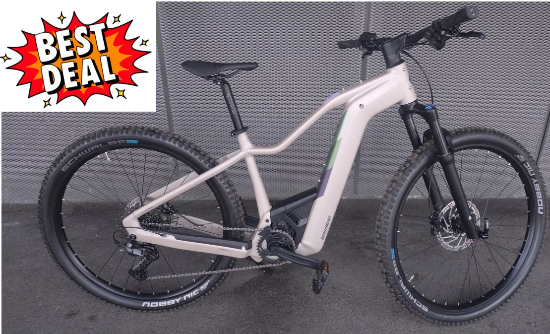 Bergamont E-Revox Pro FMN EQ Cadre : aluminium Super Lite AL-6061, 29” Fourche : Suntour XCR34, débattement 120 mm Motorisation : Bosch Performance Line CX (Gen.4 BES3) Batterie : PowerTube 625 Wh intégrée Transmission : Shimano Deore 11 vitesses Freins : Shimano à disque hydrauliques Roues-Pneus : 29” avec pneus Schwalbe polyvalents Équipements : porte-bagages, éclairage LED, garde-boue Un e-VTT semi-rigide polyvalent, parfait pour le trekking sportif et les trajets quotidiens.