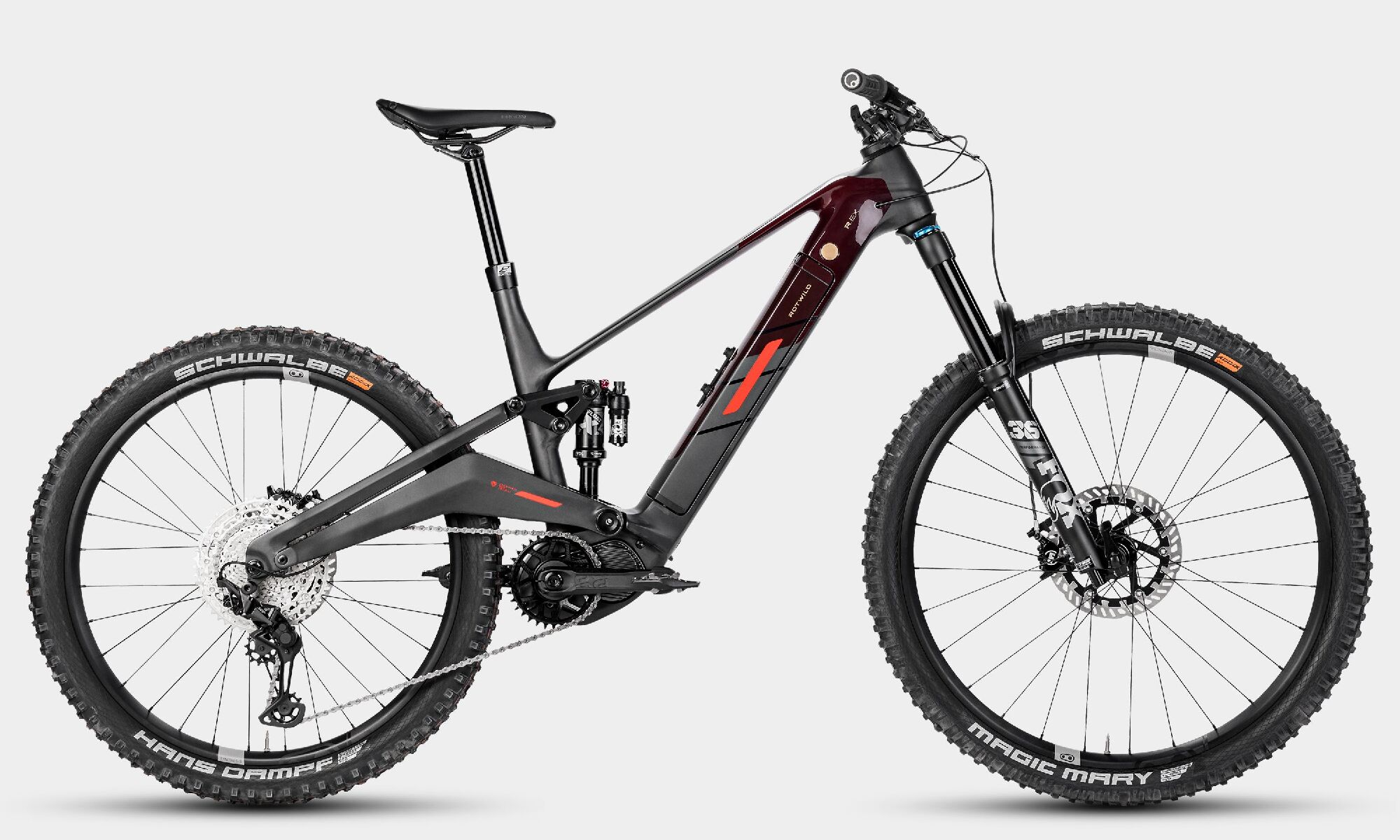 The start of the E-Enduro World Cup season marks the beginning of an exciting era at ROTWILD: the return to international mountain bike racing. We already have the bike for it, packed with innovations – that's how it is in racing. Our engineers have rethought the chassis and developed the Elevated Box Design. This Mid-High Pivot System works around a higher pivot point and elevates the bike's riding dynamics to a new level. The high rear triangle stiffness and optimized anti-rise and anti-squat values make it the ideal companion for E-Enduro racing. With 170 mm of front travel, mullet setup, adjustable geometry, and rear triangle length, the R.EXC sets new standards in versatility and performance. What does the name mean? The three letters stand for ultimate performance: E for Enduro, X for versatility, and C clearly signals Competition. In terms of drive technology, we rely on the dynamic Shimano EP801 motor, which can be individually and extensively adjusted to the personal preferences of the racers. The position of the new 820 Wh battery ensures a low and thus dynamically favorable center of gravity, providing an optimal balance between downhill performance and agility. Thanks to the Quick Release System, the battery can also be quickly and easily removed – because that matters in a race. The R.EXC embodies the ROTWILD racing DNA, combining performance, innovation, and precise engineering, and will now be on the hunt for best times with the ROTWILD Schwalbe Gravity Team.