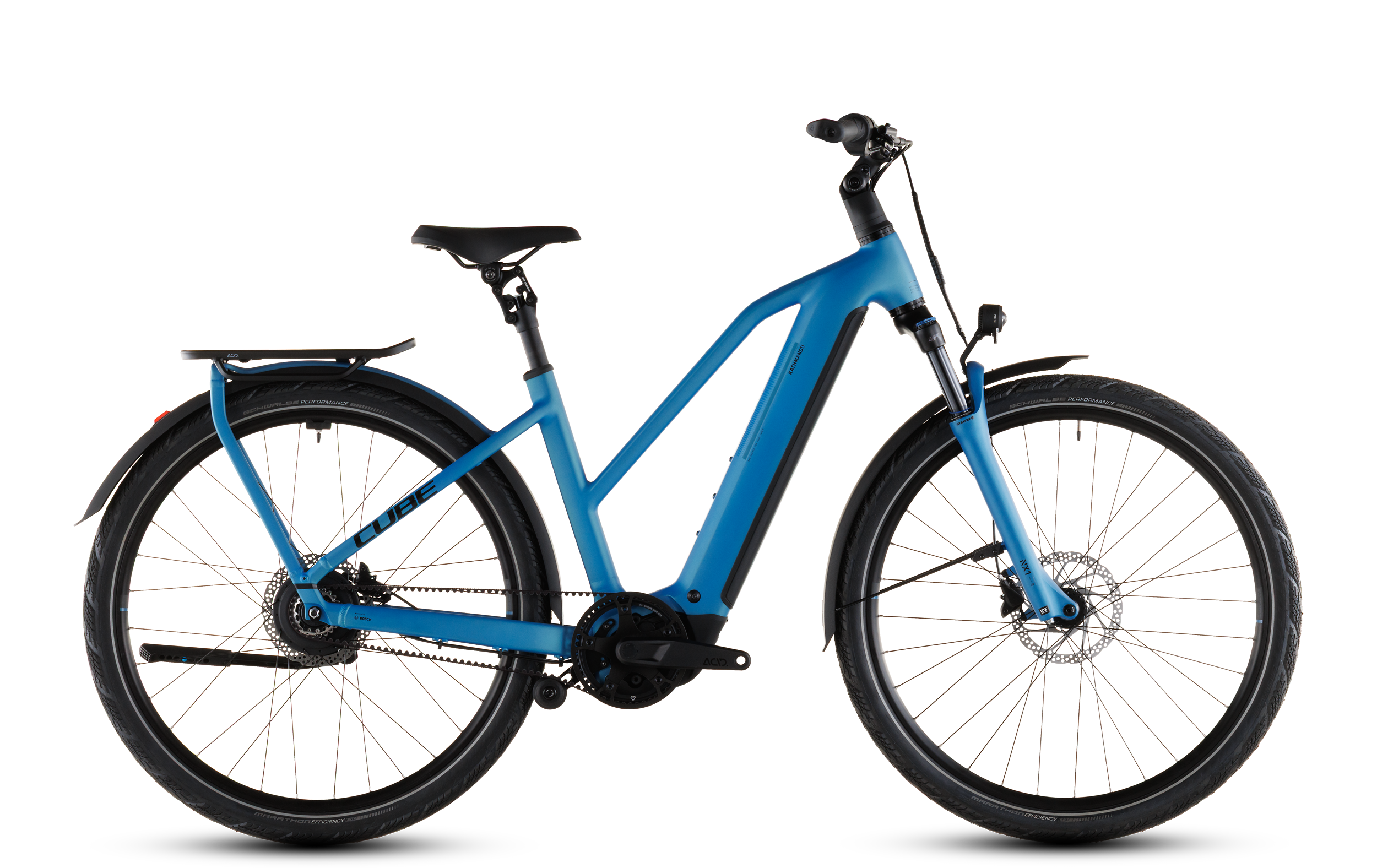 The clean lines of the CUBE Kathmandu Hybrid Comfort Pro may be deceptive, as this elegant tourer has some unbeatable technical assets up its sleeve. For example, a continuously adjustable Enviolo hub gear – just turn it until the perfect gear is engaged – and a belt instead of a (greasy) chain. Its Bosch CX drive provides up to 90 Nm of torque, which means efficient support for energy-saving pedaling on all routes and climbs. The powerful 800 Wh PowerTube battery ensures the necessary range, and because such propulsion also needs to be controlled effectively, we have installed powerful hydraulic disc brakes from Shimano that reliably slow down the bike even in wet conditions. What else? A Suntour air suspension fork, an adjustable stem, a parallelogram seat post, our integrated IC 3.0 luggage rack, and a complete accessory package. On the bike, ready, go!