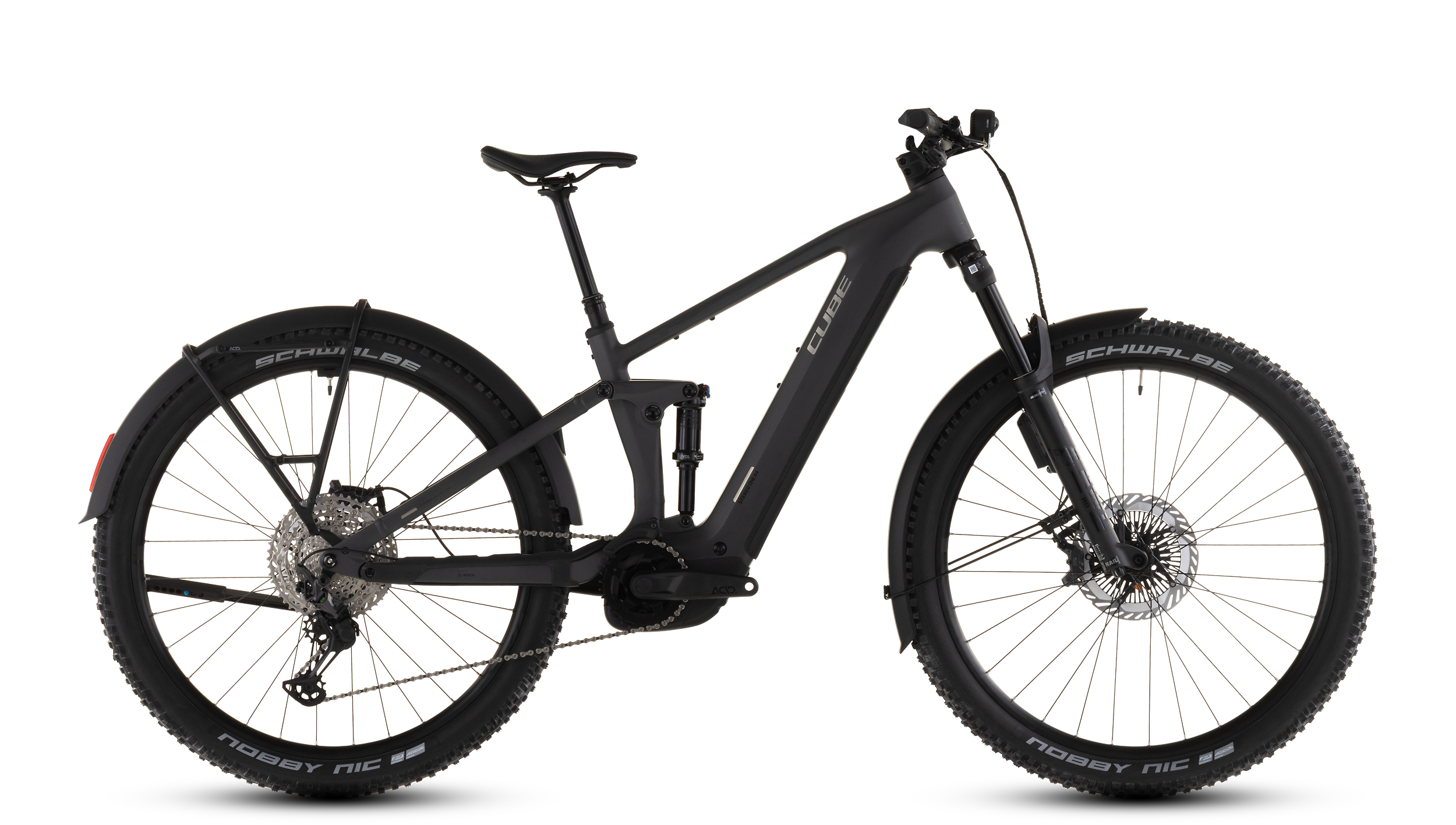 A bike that can do it all and keep up? Sure. The Stereo Hybrid ONE44 EXC 800 FE is a true all-rounder, equipped as standard with fenders, a luggage rack, and lights. This fully suspended bike performs just as well on the daily commute to the office as it does on extended weekend rides. Its off-road capabilities are thanks to the 140 mm travel of the 36 Float AWL fork and the Float Rhythm RC shock from Fox. The grippy Schwalbe Nobby Nic 2.6-inch tires and powerful hydraulic Shimano XT disc brakes with ABS Pro technology provide a reliable and well-controlled riding experience even in tricky conditions. Last but not least, there's up to 100 Nm of torque from the Bosch CX motor paired with an 800 Wh PowerTube battery, which, in conjunction with the extremely versatile Shimano XT 12-speed drivetrain, delivers efficient support for forward motion. For plenty of riding fun on tours!