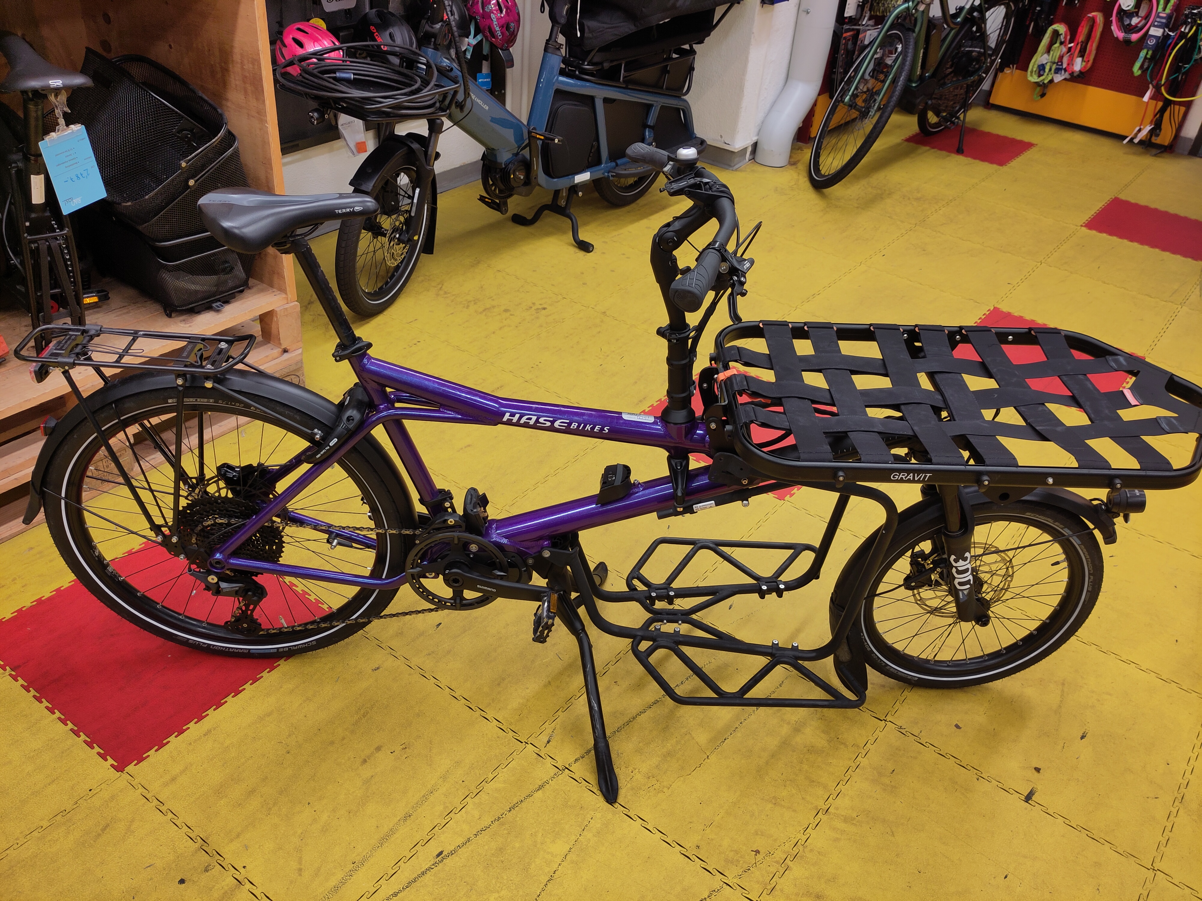Discover the ultimate ride with the Hase Bikes Gravit Cargobike, a 2017 demo model that combines style and functionality! This vibrant violet e-bike is perfect for transporting your cargo, featuring a sturdy aluminium frame and smooth 26-inch wheels. With powerful Shimano gears and hydraulic disc brakes, every journey is a breeze, whether you're navigating city streets or exploring the countryside. Plus, the robust 504 Wh battery ensures you can go the distance with ease. Experience the freedom of movement and versatility this cargo bike offers—your next adventure awaits in Aargau!