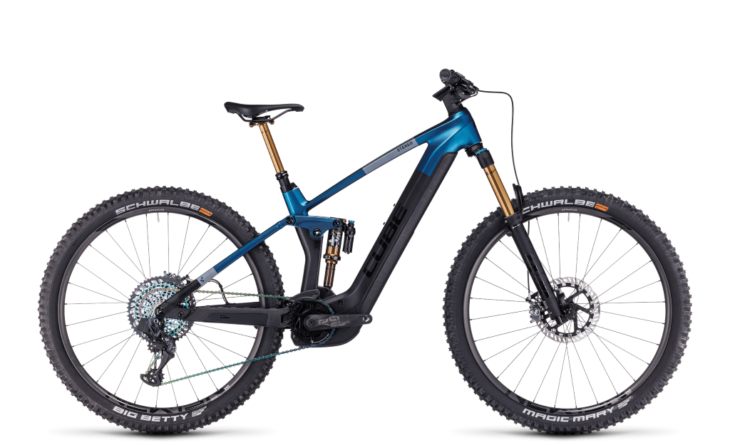 The Stereo Hybrid 140 HPC SLT 750 throws all previous principles for all-mountain e-bikes out the window. On one hand, it features Sram's wireless AXS shifting technology, which shifts gears so precisely that it's a true joy. On the other hand, it boasts Newmen Advanced Carbon wheels with 2.4-inch Schwalbe Magic Mary and Big Betty tires, along with Magura's hydraulic 4-piston MT7 disc brakes with two-piece rotors for top-notch speed control, even in the harshest weather. The smoothly operating Bosch CX motor of the fourth generation delivers a whopping 85 Nm of torque to the trail. And the powerful 750 Wh battery gives the bike its enormous range. The Fox 36 Factory fork and the Float X Factory create a buttery smooth suspension for excellent grip and tracking. Additionally, we have installed a dropper seat post that provides an extra dose of control, especially on steep trails. Unbeatable performance without compromises!