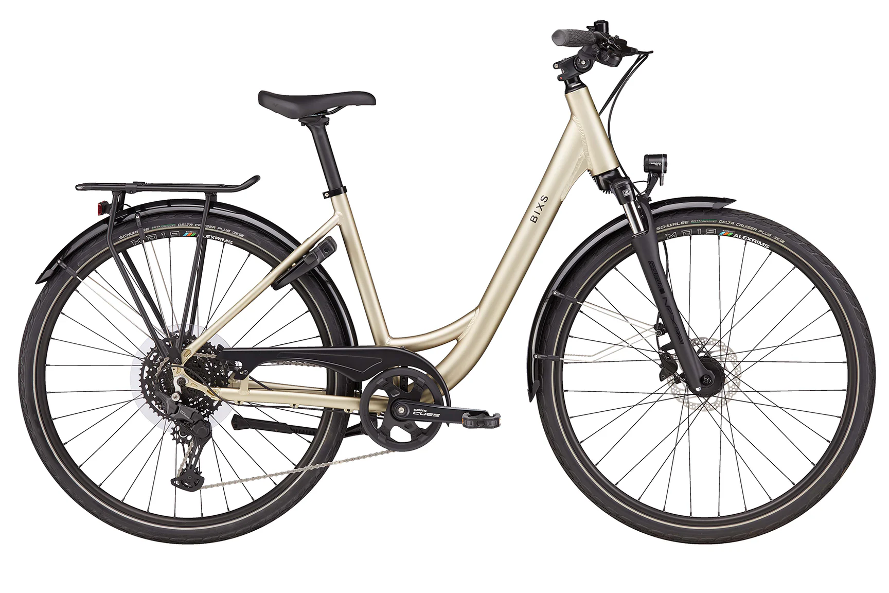 It scores points with its equipment. No frills, but everything needed to travel comfortably on asphalt and along riverbanks. From the high-quality suspension fork to the luggage rack, fenders, kickstand, sturdy tires, frame lock, and lights, everything is included.