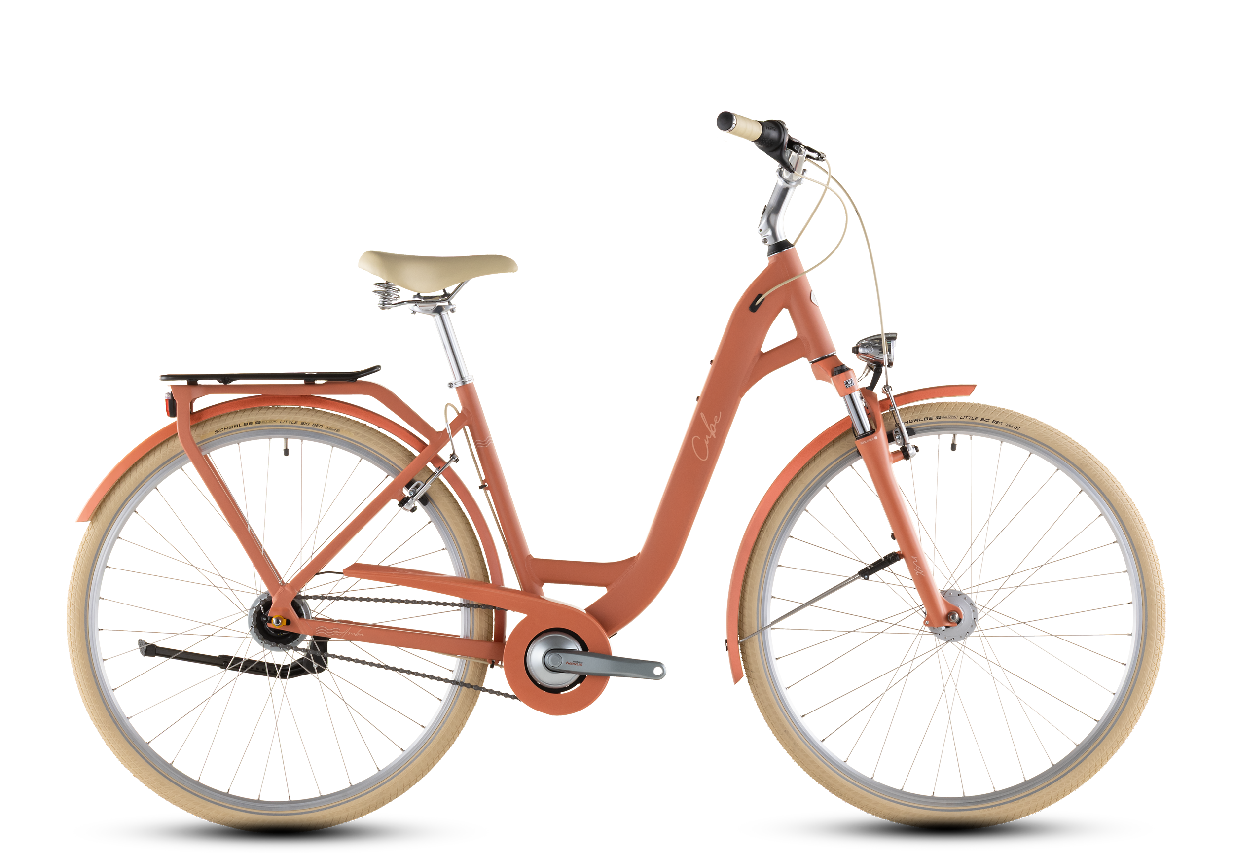 Stylish look, great handling: The Aruba impresses with its chic, harmonious design that exudes a lot of retro flair. On the other hand, it offers many practical features for comfortable support that city fashionistas appreciate while cruising through the urban jungle. Thanks to the comfortable seating position and a reliable, easy-to-use 8-speed hub gear from Shimano, the bike rolls along smoothly. Additionally, it comes with a luggage rack, a color-coordinated chain guard, and a suspension fork. The dynamo-powered lighting system, fenders, and a side stand complete the setup. Conclusion: With this two-wheeled BFF, you are ready for anything – whether it's work, city adventures, or relaxing in the green.