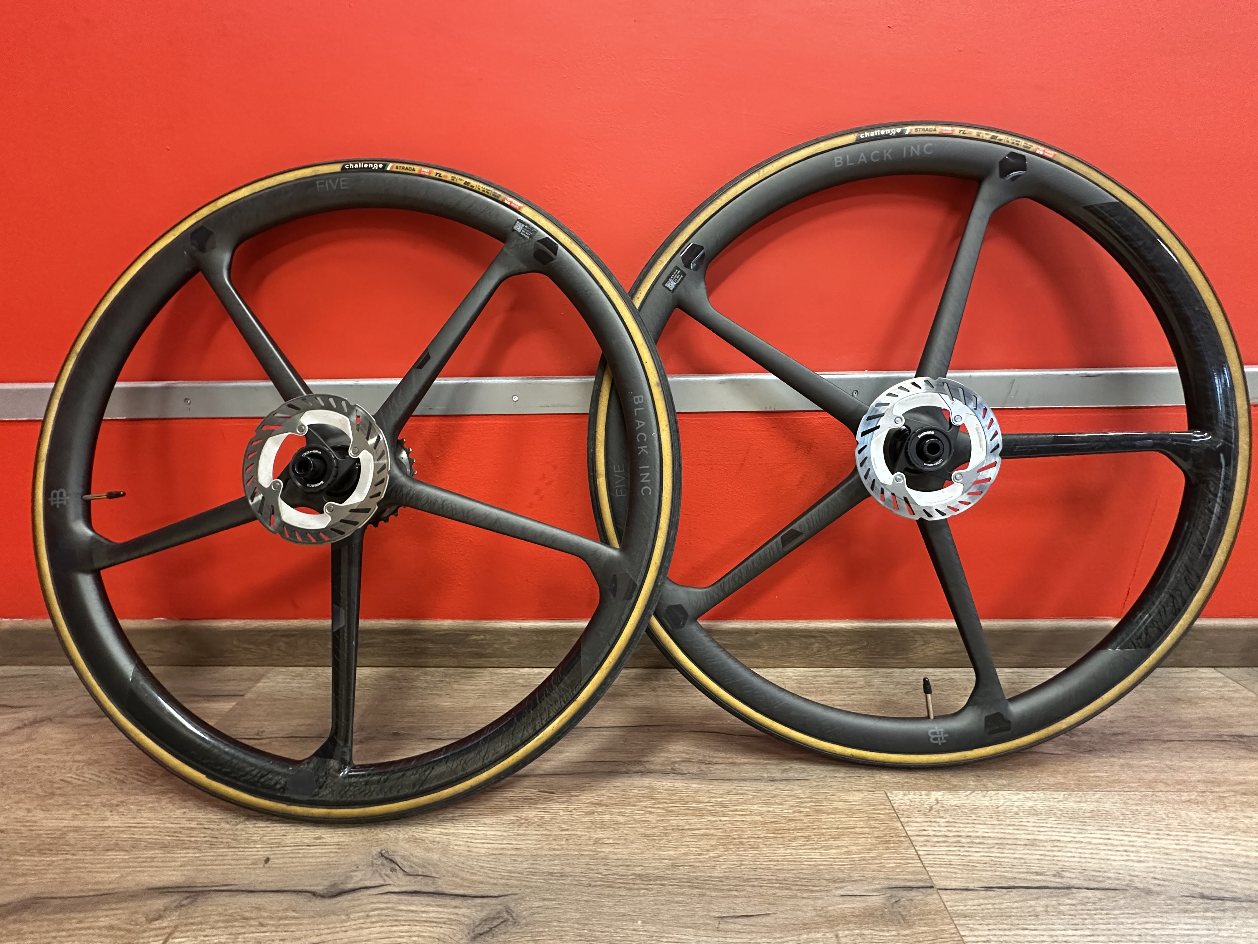 Ruote complete Black Inc FIVE con body e dischi Shimano, cassetta SRAM RED, copertoni Challenge. Prezzo trattabile.