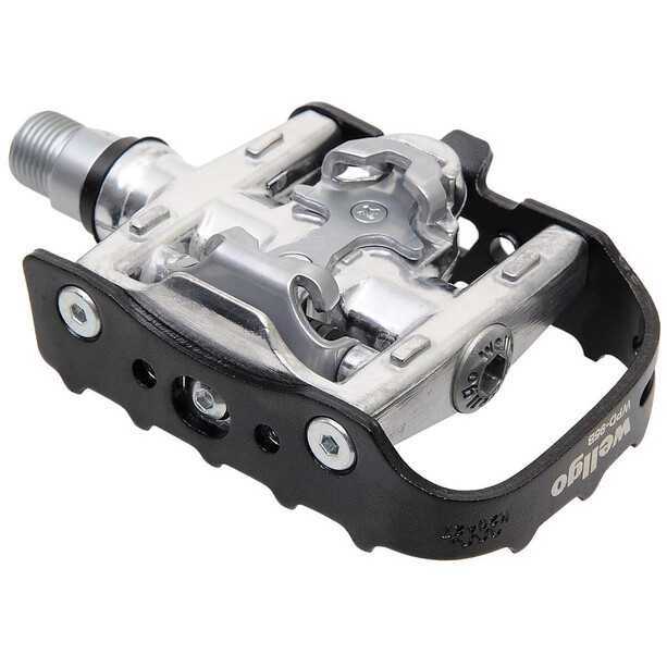 The combination pedal is ideally suited for mountain biking, trekking, and everyday use thanks to the combination of a half-sided platform and clipless pedal. The binding is thus only possible on one side: while one side features a platform as a tread area, the other side offers the SPD pedal system, providing secure hold through the connection of pedal with pedal plates/cleats. Extra light due to the aluminum pedal body and CrMo axle. Flexibility through 4° lateral play. The maintenance-free industrial bearing is low-friction and sealed. The release hardness is adjustable (indicator display). Compatible with Shimano.
