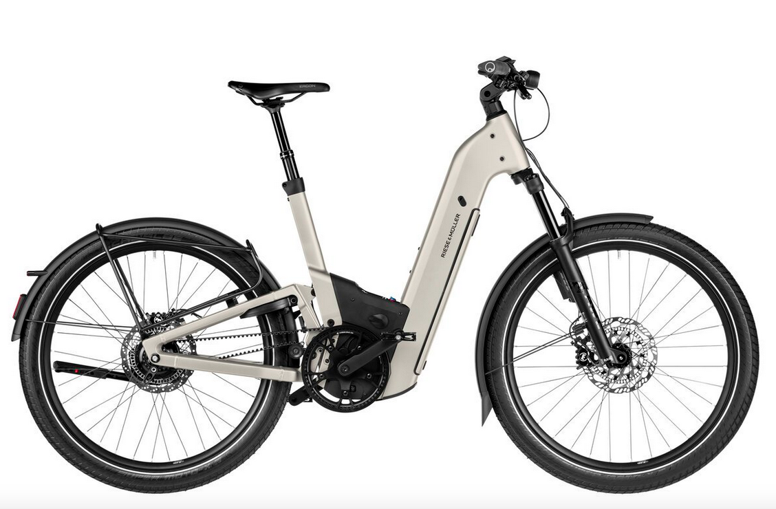 S-Pedelec | Marque: Riese & Müller Modèle: Homage5 GT Pinion HS Equipement: Pinion E.12 S, Courroie | Couleur: Warm Silver Cadre: Tout suspendu, S 47cm Matériau Cadre: Alumnium Garantie Cadre: 5 ans après inscription (sinon 2 ans) Fourche: Fox AWL 34, Air, 120mm Amortisseur: Fox Float Rhythm SV 165x 45mm Taille cycliste: 1,65-1,80m | Moteur: Pinion MGU E1.12S 48V 250W 45kmh Capacité de batterie: 800 Wh Couple du Moteur: 85- 160Nm | Poids maximal autorisé: 160 kg Poids: 34.6Kg Charge max arr.: 27Kg Charge max. Avant: 5Kg | Longueur totale env.: 194cm Empattement: 120.5cm Seuil d'enjambement: 53.5cm Hauteur axe de pédalier: 32.5cm Reach (cm): 40cm stack (cm): 65.5cm Axes de Roues: 148mm | Pneus : Schwalbe Super Moto-X Pression des pneus: 2.0-4.0Bar Taille des pneus: 62- 584 | Freins: Tektro TRP HD-EU835 Dimension Disques: 2x TRP 203-2,3mm R203S01E | Entrainement arr.: CDX 28Dents Entraînement Avt.: CDX 39Dents Courroie/Chaîne: CDX 130Dents | Roues: 27.5" Boost. arr. singlespeed Rodi35 Evo, avt. GT Novatec Boost Moyeu roue Arr.: Novatec Boost, QR, 36Trous Moyeu roue Avt.: Novatec Boost, QR, 32Trous Eclairage: Arr. Supernova M99, à rétro-éclairage & avertisseurs de freinage. Avt. Mini Pro-45 Cockpit: Satori R&M Custom, ø 25,4mm Tige de selle: X-Fusion Manic 100