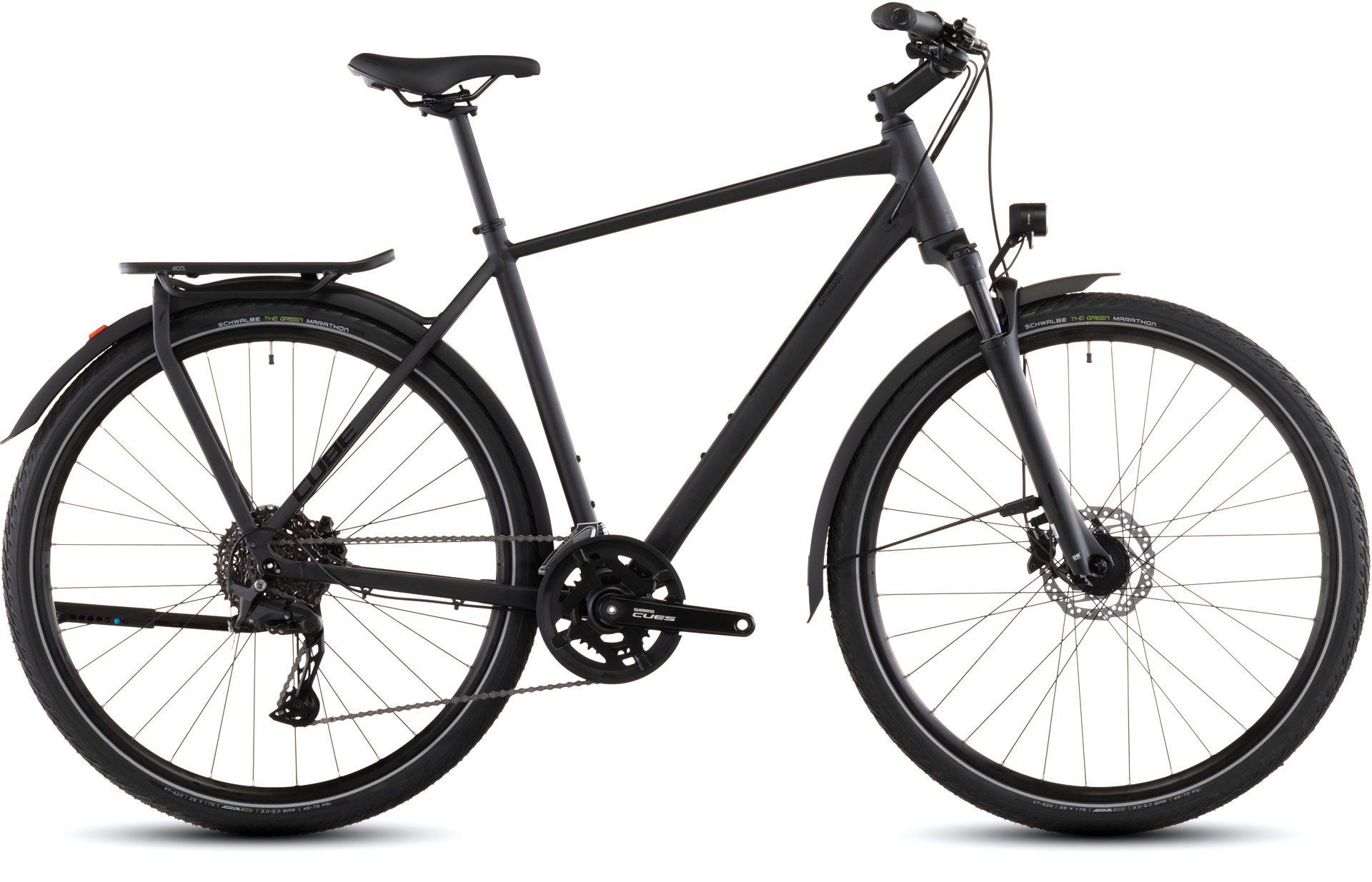 Le CUBE Kathmandu Pro a tout ce qui est important et se passe de fioritures inutiles. Son élégance sobre et ses grandes qualités polyvalentes sont dues au porte-bagages intégré IC3.0, aux garde-boue, aux lumières avant et arrière, ainsi qu'au béquille latérale CUBE FM. Avec sa construction robuste, ce vélo de randonnée est également performant sur de longues distances. Confortable : la fourche à suspension à air Suntour qui aplanit tous les bosses ou nids de poule sur le parcours, et les pneus Green Marathon de Schwalbe, dont le mélange de caoutchouc est en grande partie composé de caoutchouc recyclé – un plus pour l'environnement. Shimano fournit sa large gamme de dérailleurs Cues 2x10 vitesses – chaque itinéraire devient une promenade. Les freins à disque hydrauliques Shimano correspondants permettent des manœuvres de freinage sûres, même par temps humide et en pleine charge. Que ce soit dans la jungle urbaine ou en pleine nature : le Kathmandu Pro est toujours présent !