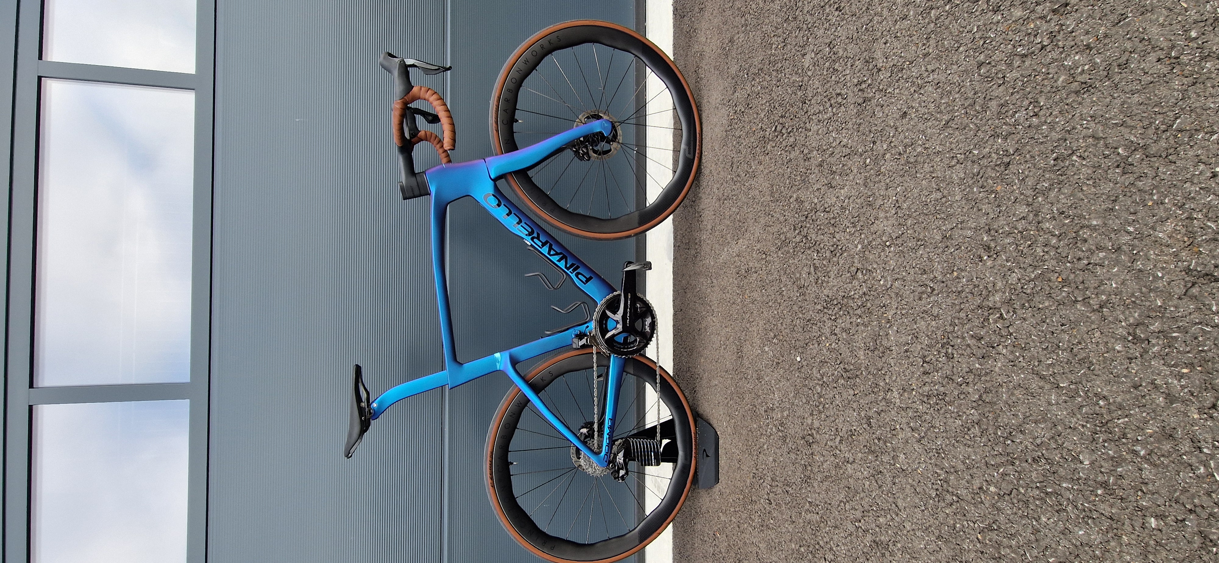 Vélo Pinarello Dogma F monté avec groupe Shimano Dura Ace Di2, manivelle 50/34, cassette 11-30, boîtier de pédalier Ceramicspeed, bras de dérailleur Aero Ceramicspeed (optionnel sans), chaîne traitée avec de la cire Ceramicspeed, jeu de roues Princeton Peak EVO 4550 avec pneus Continental GP5000 S TR, tubeless, cockpit en carbone Pinarello et selle en carbone Most, porte-bidon en titane.