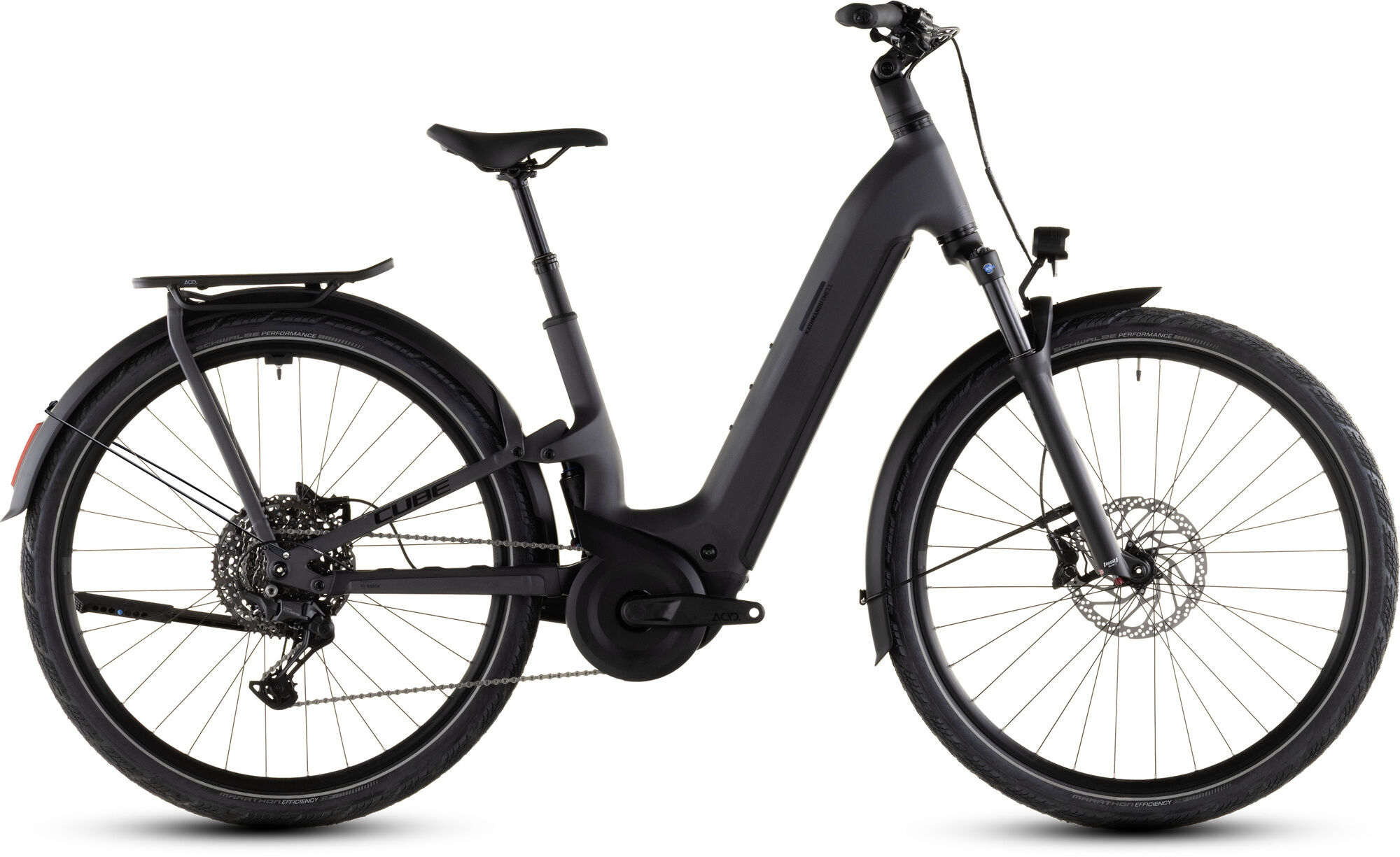 Il nostro Kathmandu Hybrid ONE11 HPC Pro combina una sospensione completa con un motore Bosch – il risultato: un E-Tourer altamente efficiente con un comfort di guida geniale e una trazione ottimizzata, anche su strade accidentate o piste sterrate. La sua forcella ad aria Suntour XCR34X e l'amortizzatore Edge 2CR abbinato offrono fino a 100 mm di escursione e assorbono tutte le vibrazioni e i colpi dal terreno come nulla. A bordo c'è naturalmente anche il nostro portapacchi integrato IC 3.0 per tutto ciò che deve essere portato in tour. Il cambio Shimano Cues a 11 velocità, affidabile e facile da usare, lavora in armonia con il potente motore CX E di Bosch. Quest'ultimo è alimentato da una batteria da 800 Wh, così la bici non resta mai senza energia prematuramente. I freni a disco idraulici Shimano afferrano con decisione e offrono un controllo eccellente durante la frenata e l'arresto. E ancora? Pneumatici robusti e grip Schwalbe Marathon Efficiency da 55 mm, un attacco manubrio regolabile e un reggisella telescopico per un'esperienza di guida ancora più confortevole.