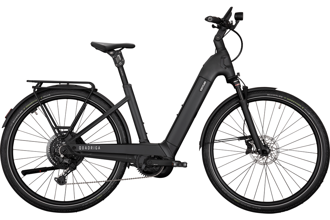 La nuova QUADRIGA CX10 offre una combinazione impressionante di tecnologia innovativa e componenti di alta qualità. Il nuovo motore Performance Line CX garantisce un'esperienza di guida particolarmente armoniosa grazie a una sensoristica ottimizzata e a una riduzione del rumore. La geometria del telaio migliorata e il copri-catena in alluminio assicurano comfort e durata. Con il montaggio opzionale del cestino anteriore e il logo illuminato, la QUADRIGA CX10 stabilisce nuovi standard in termini di design e funzionalità. L'entrata bassa e ampia facilita la salita e la discesa durante le fermate quotidiane in città. L'ampia superficie dello schermo del display Bosch Kiox 500 mostra chiaramente informazioni importanti come il livello della batteria, l'autonomia o la velocità. I pulsanti più grandi migliorano notevolmente l'usabilità. Sulle strade sconnesse o sui sentieri sterrati, la forcella a molla ad aria Suntour e il supporto a parallelogramma di by.schulz garantiscono un elevato comfort di guida. Per maggiore stabilità quando si parcheggia la bici elettrica, è possibile montare un cavalletto a due gambe. Questo rende il carico e lo scarico della bici più semplice e sicuro. Il supporto integrato nel telaio per un modulo GPS installabile successivamente migliora la protezione contro i furti tramite tracciamento. La QUADRIGA CX10 è la scelta sicura e confortevole per l'uso quotidiano.