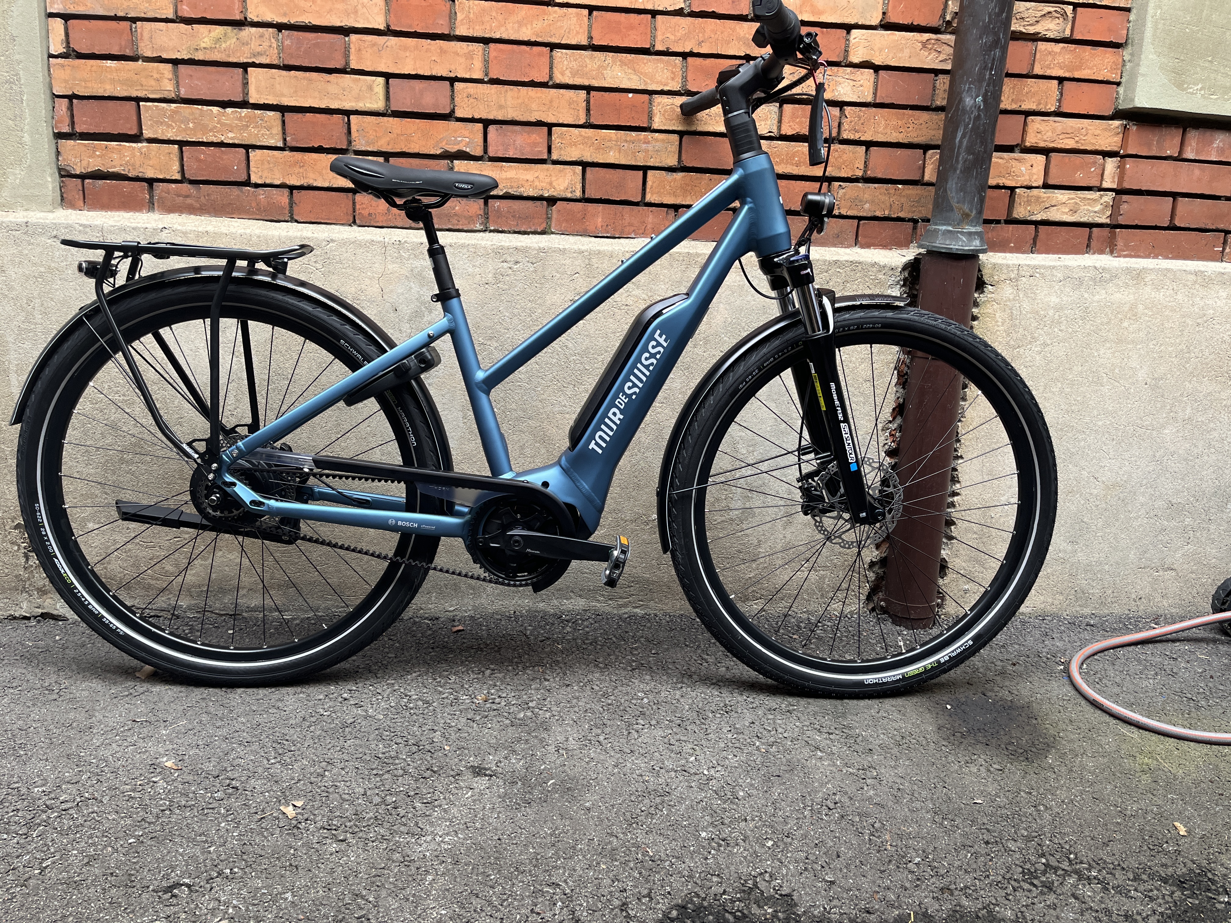 Scopri la nuova Tour de Suisse Rückenwind 25, la bici perfetta per le tue avventure in città! Con il suo design elegante in blu e il telaio in alluminio, questa e-bike ti porterà ovunque con stile e comfort. Grazie al motore Bosch e alla batteria da 545 Wh, avrai sempre la spinta giusta per affrontare ogni salita. Le ruote da 28 pollici e i freni a disco idraulici garantiscono una guida fluida e sicura. Non perdere l'occasione di vivere la libertà su due ruote!