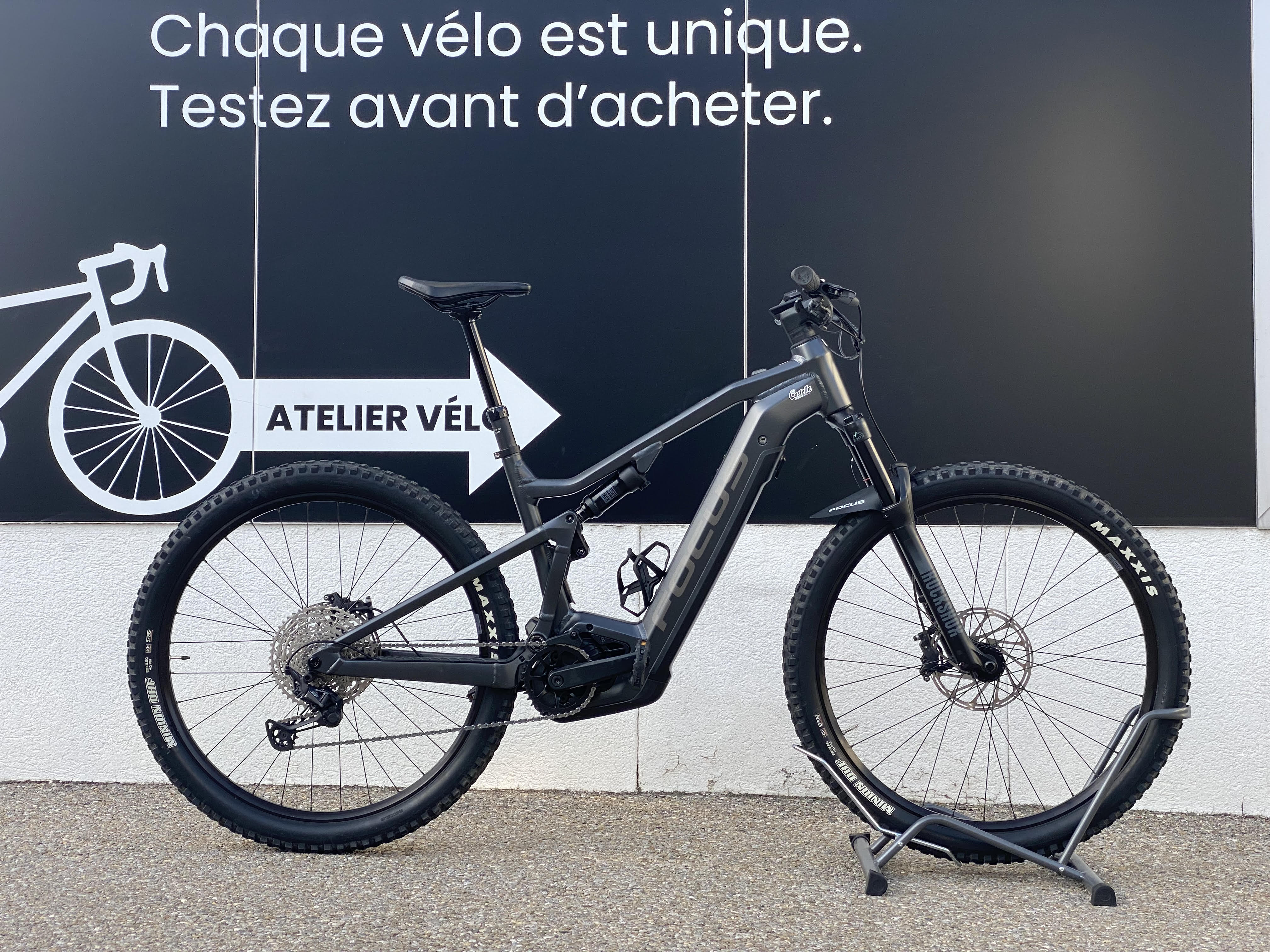 🚵 Focus Jam² – Bosch Performance CX & batterie 750 Wh Cadre : aluminium, intégration batterie, géométrie all-mountain Fourche : RockShox 35, 150 mm Amortisseur : RockShox Deluxe Select+ Motorisation : Bosch Performance Line CX Gen.4 Smart System Batterie : Bosch PowerTube 750 Wh Transmission : Shimano XT 12 vitesses Freins : Shimano à disque hydrauliques 4 pistons Roues : 29″ aluminium tubeless ready Pneus : Maxxis Minion / Dissector pour l’enduro/trail Tige de selle : télescopique intégrée 👉 Un e-MTB polyvalent, puissant et fiable, parfait pour les longues sorties en montagne comme pour l’enduro engagé.