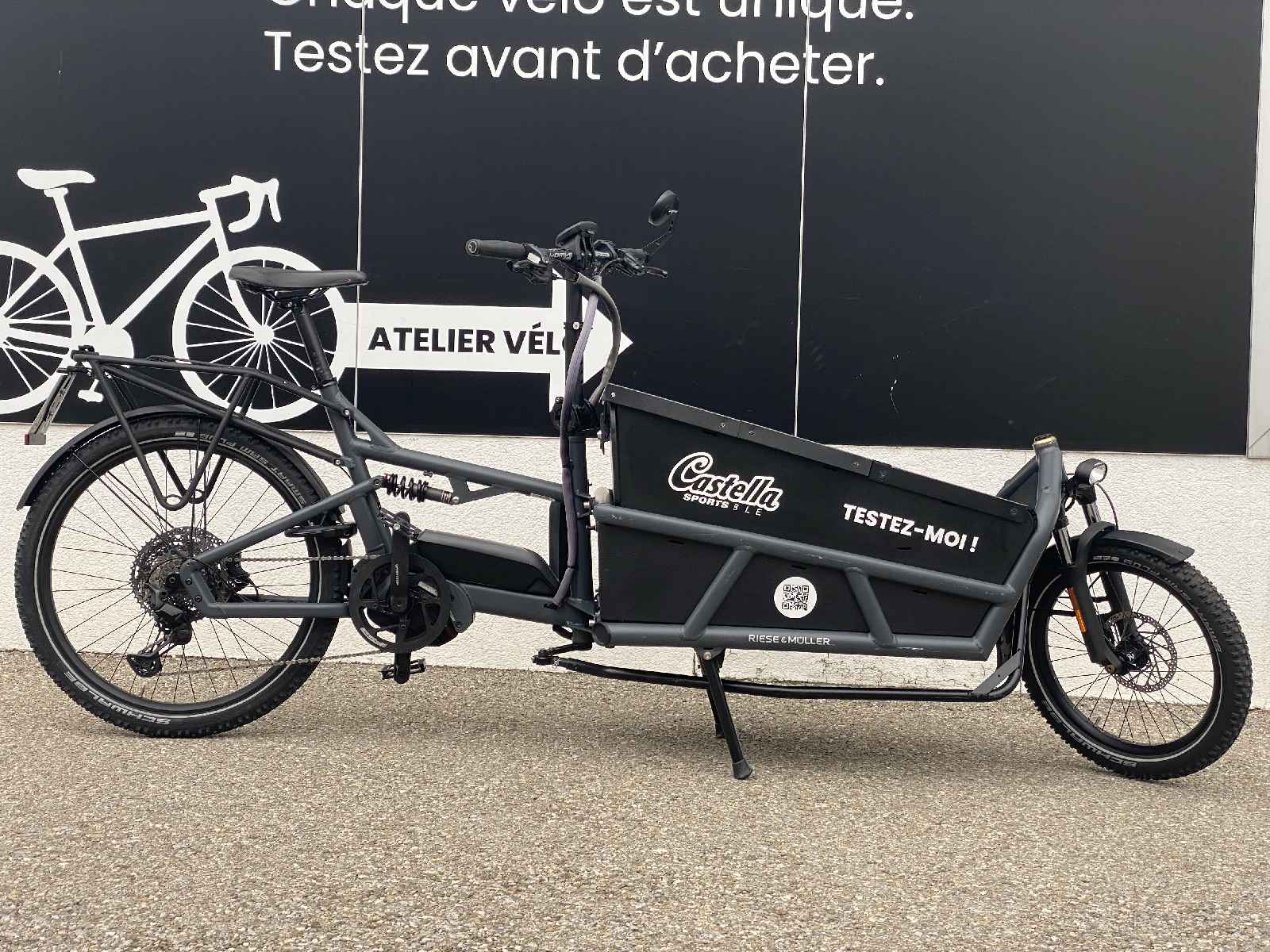 Cadre : aluminium suspendu intégralement, capacité de chargement XXL Motorisation : Bosch Cargo Line Smart System (85 Nm) Batterie : Bosch PowerTube 750 Wh Transmission : Shimano Deore XT 11 vitesses Freins : Magura MT5e 4 pistons hydrauliques Roues : 26”-20” avec pneus Schwalbe Super Moto-X Suspension : fourche Suntour Mobie + amortisseur arrière Accessoires : CargoBox rigide avec sièges enfants, porte-bagages, garde-boue, éclairage complet Le cargo familial haut de gamme par excellence : stabilité, puissance et confort inégalé pour transporter enfants, courses ou matériel en toute sécurité.