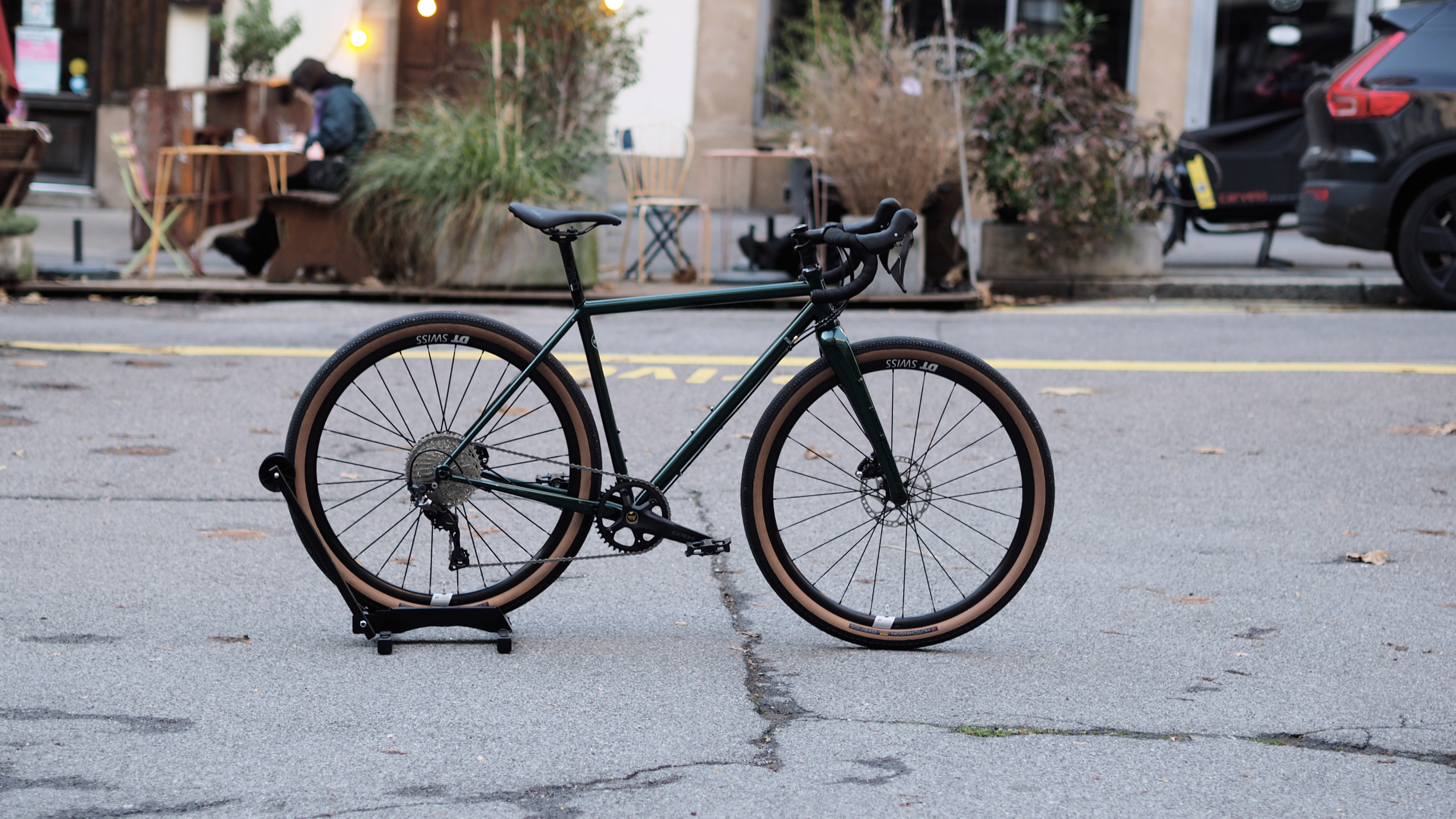 La bici è montata con una trasmissione GRX 600 a 11 velocità e ruote DT Swiss G1800 con pneumatici Hutchinson Overide 650Bx47C "Made in France". Sella e manubrio Deda Zero.